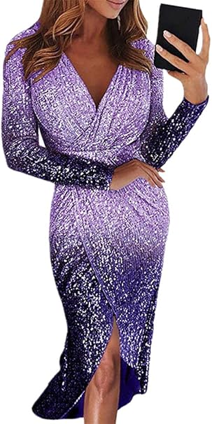 Yijinstyle Abito Con Paillettes Elegante Cena Abbigliamento Da Donna Vestito Da Sera V Collo Abito Sfumato Con Manica Lunga Abiti Per Banchetto Amazon It Abbigliamento