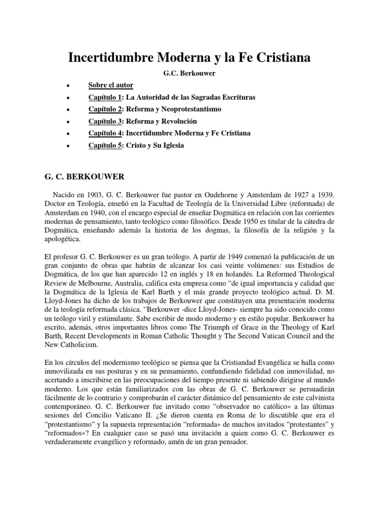 Incertidumbre Moderna Y Fe Cristiana G C Berkouwer Pdf Protestantismo Religion Y Espiritualidad